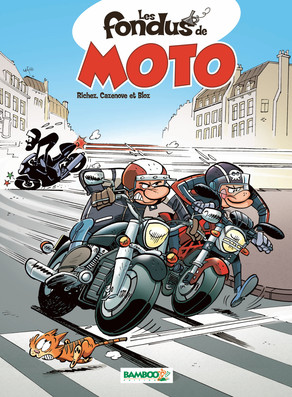 Resumen : Une odeur d'huile de synthèse, de cuir gras râpés, d'asphalte et de gomme brûlée flotte autour du local de l'association des fondus. Nos héros se sont trouvés une nouvelle passion : la moto ! Prises d'angle, trajectoires à la corde, repères de freinage, mauvaise foi en Ducat' , Yam' , BSA, Harley ou Suzuk' , le milieu n'a désormais plus de secrets pour eux. Peu importe où l'on va, l'important est d'y aller vissé sur sa bécane, sa brêle, d'arsouiller avec les collègues, de faire péter les gaz et d'enfumer le prétentieux qui tire la bourre croyant avoir une chance de toucher l'horizon avant vous. Allez, en route pour l'autoroute du délire et vroarrr ! |